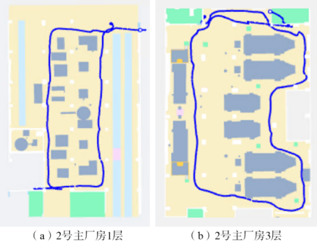 在紅柳林選煤廠部署了1套地磁定位系統(tǒng),地磁定位精度測試路線如圖12所示,對2號主廠房的1~6層,按照如下步驟測試地磁定位精度,設(shè)定好測試路線,實(shí)際測試1~6層,為了節(jié)省篇幅,給出其中2層的具體測試圖例。