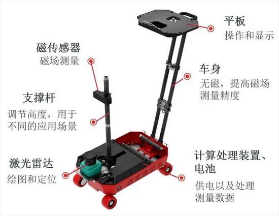 采用基于激光雷達(dá)的專業(yè)地磁測量裝置進(jìn)行地磁場數(shù)據(jù)采集,磁圖測量裝置如圖8所示。磁圖測量裝置由無磁小車、激光雷達(dá)、磁傳感器、工控板等組成。無磁小車是磁圖測量裝置的載體,所有設(shè)備都在無磁小車上安裝,推動小車在測量場地內(nèi)行走,實(shí)現(xiàn)位置和磁場數(shù)據(jù)的同步采集。采集以車作為載體,避免人為操作習(xí)慣差異導(dǎo)致的測量誤差;激光雷達(dá),通過SLAM技術(shù)實(shí)現(xiàn)室內(nèi)地圖及位置信息的測量,定位精度優(yōu)于0.1 m;磁傳感器測量磁場信息;磁場數(shù)據(jù)、激光雷達(dá)數(shù)據(jù)在工控板內(nèi)進(jìn)行同步和存儲。