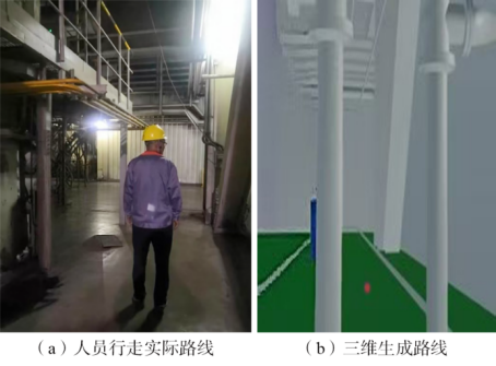 (3)完成后提取定位軌跡,得到測試人員經(jīng)過測試點(diǎn)位附近時(shí)候的位置坐標(biāo),并和測試點(diǎn)位實(shí)際坐標(biāo)進(jìn)行對比,計(jì)算定位誤差,定位軌跡路線如圖14所示,測試結(jié)果表明計(jì)算得到的定位結(jié)果和實(shí)際行走路線吻合,44號位置參考點(diǎn)實(shí)景和三維對比如圖15所示。
