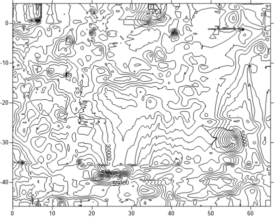 圖10 均勻網(wǎng)格化后的地磁場等值線分布