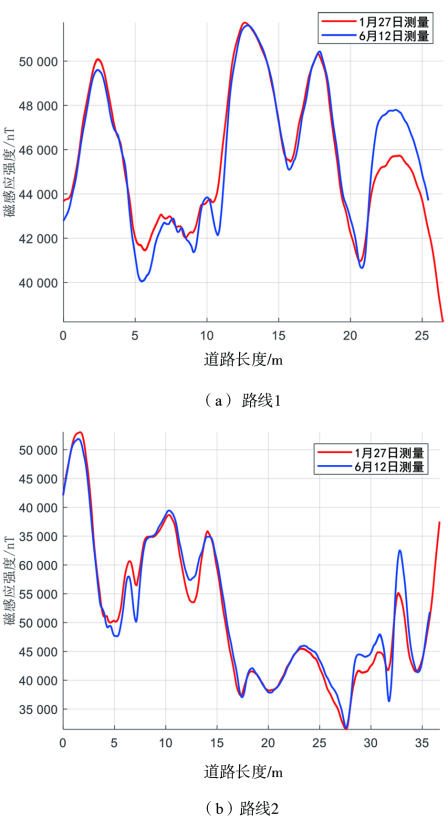 圖3表明不同路線的地磁場存在明顯差異,利用此差異可計(jì)算人員當(dāng)前所在路線及具體位置。當(dāng)時(shí)間不同時(shí),磁場特征穩(wěn)定,不會隨時(shí)間發(fā)生較大改變;如圖3中同一條路線,1月27日測量的磁場分布特征和6月12日測量的磁場特征基本相同,證明了磁場特征隨時(shí)間的穩(wěn)定性,表明磁場地圖測繪建立后,無需頻繁更新。