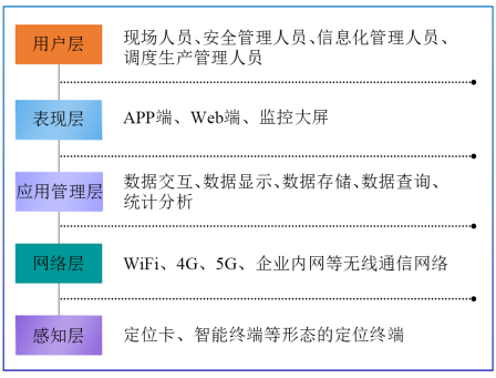 基于地磁定位技術(shù)的選煤廠人員定位系統(tǒng)設(shè)備組成如圖4所示,主要包括定位終端(硬件設(shè)備)和定位引擎(軟件算法),系統(tǒng)架構(gòu)如圖5所示,主要包括用戶層、網(wǎng)絡(luò)層、應(yīng)用管理層、表現(xiàn)層和用戶層。
