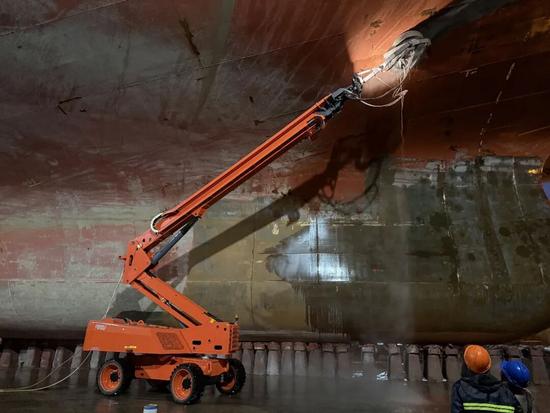 近期,以模塊化臂式平臺(tái)為基礎(chǔ),鼎力船舶除銹噴涂機(jī)器人系列再添一員,且已正式服役于某船廠。