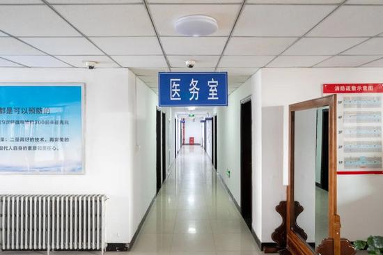 該醫(yī)務室設有診療區(qū)、藥械室、觀察室,配有血壓計、心電圖儀、AED除顫儀等,藥架上整齊擺放著百余種常用藥品