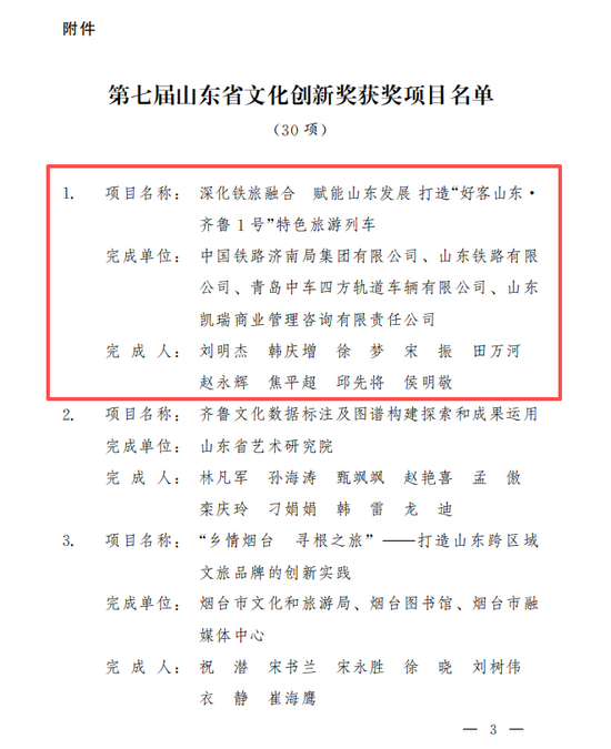 近日,山東省人民政府公布“第七屆山東省文化創(chuàng)新獎(jiǎng)”獲獎(jiǎng)項(xiàng)目,山東鐵投集團(tuán)權(quán)屬山東鐵路有限公司參與的《深化鐵旅融合 賦能山東發(fā)展 打造“好客山東?齊魯1號(hào)”特色旅游列車》項(xiàng)目憑借突出的創(chuàng)新性、實(shí)踐性與示范性,從眾多參評(píng)項(xiàng)目中脫穎而出,榮獲第七屆山東省文化創(chuàng)新獎(jiǎng)。