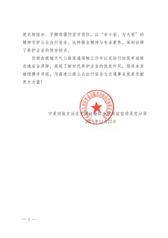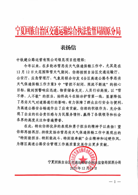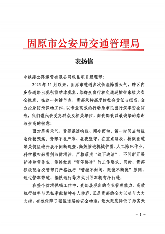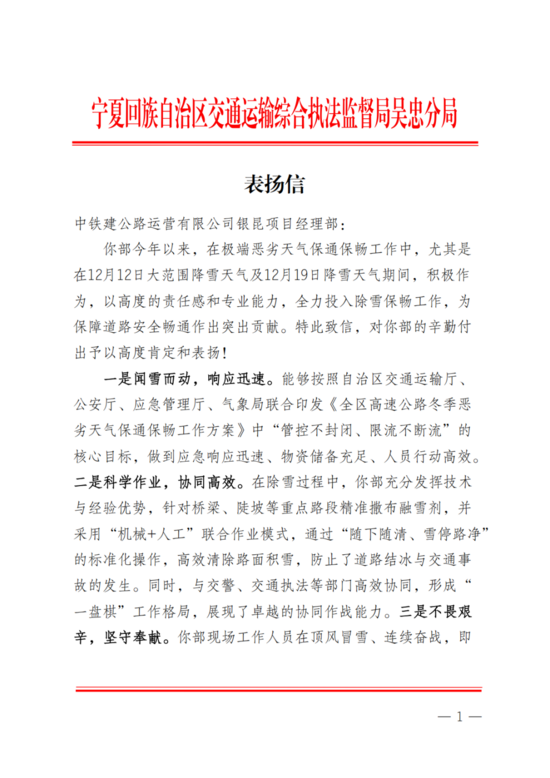 表揚(yáng)信中指出,公路運(yùn)營公司銀昆項(xiàng)目經(jīng)理部在本次除雪工作中展現(xiàn)出“特別能擔(dān)當(dāng)、特別能戰(zhàn)斗、特別能奉獻(xiàn)”的企業(yè)精神與過硬作風(fēng),為保障區(qū)域路網(wǎng)暢通和安全出行作出了積極貢獻(xiàn)。