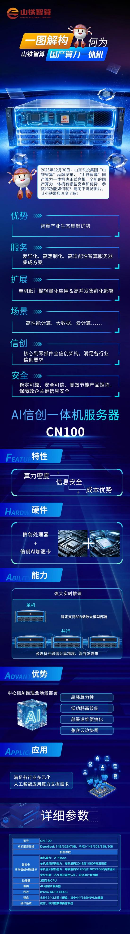 2025年12月30日,山東鐵投集團(tuán)“山鐵智算”品牌發(fā)布,“山鐵智算”國產(chǎn)算力一體機(jī)也正式亮相。全新的國產(chǎn)算力一體機(jī)有哪些亮點(diǎn)和優(yōu)勢(shì)、參數(shù)和功能如何呢?請(qǐng)向下瀏覽圖片,讓小鐵帶您深度了解!