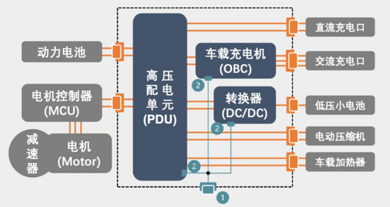 PDU( Power Distribution Unit) 高壓配電單元/高壓配電盒:負(fù)責(zé)整車高壓電能的分配、管理及安全保護(hù)。它將高壓電池的高壓直流電分配至電機(jī)控制器、車載充電機(jī)OBC、空調(diào)壓縮機(jī)、PTC加熱器、DC/DC控制器等關(guān)鍵部件。