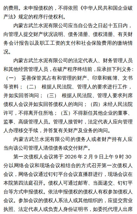 內(nèi)蒙古武蘭水泥有限公司的債權(quán)人應(yīng)于2026年2月3日前向內(nèi)蒙古武蘭水泥有限公司管理人申報(bào)債權(quán)。第一次債權(quán)人會(huì)議將于2026年2月9日上午9時(shí)30分以網(wǎng)絡(luò)會(huì)議和現(xiàn)場會(huì)議相結(jié)合的方式召開。