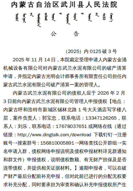 日前,根據(jù)內(nèi)蒙古自治區(qū)武川縣人民法院發(fā)布的公告顯示,2025年11月14日,內(nèi)蒙古自治區(qū)武川縣人民法院裁定受理申請人內(nèi)蒙古金涌機(jī)械設(shè)備有限公司對內(nèi)蒙古武蘭水泥有限公司的破產(chǎn)清算申請,并指定內(nèi)蒙古光明會(huì)計(jì)師事務(wù)所有限責(zé)任公司擔(dān)任內(nèi)蒙古武蘭水泥有限公司破產(chǎn)清算一案的管理人。