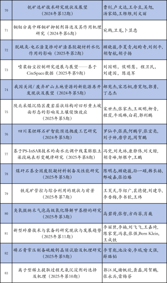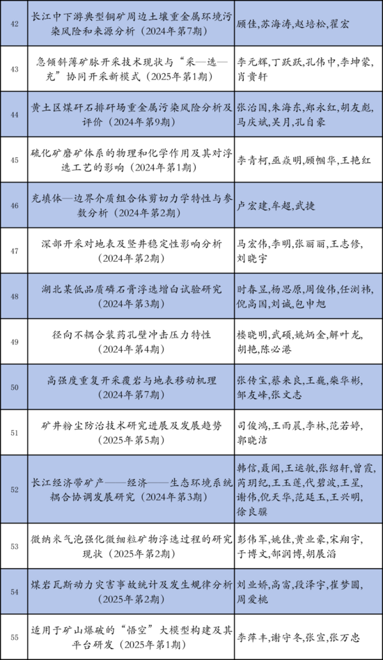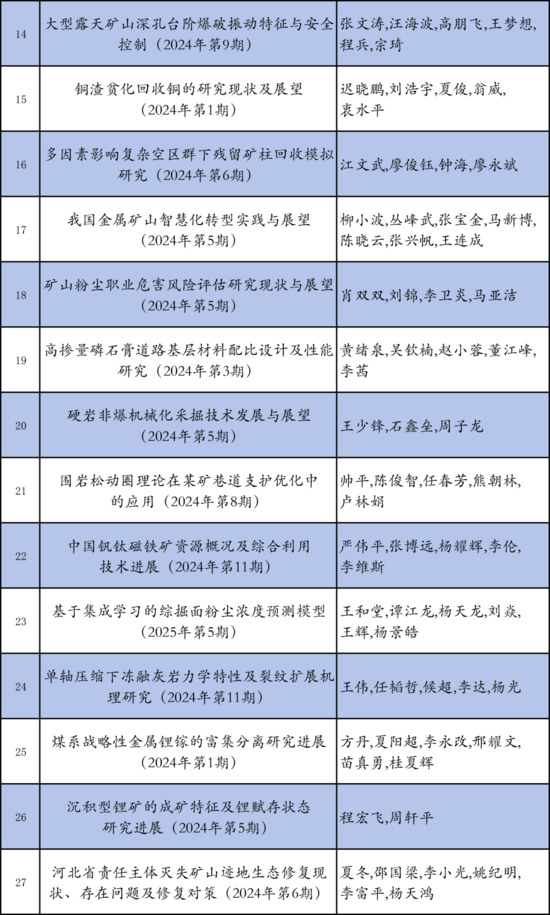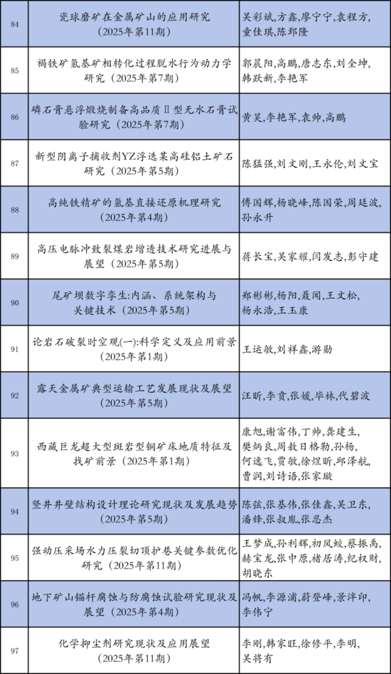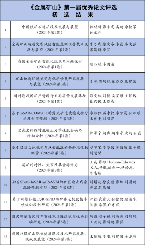 《金屬礦山》多年保持460篇/年的論文發(fā)表規(guī)模,覆蓋面廣、研究度深,許多成果一經(jīng)發(fā)布,即在行業(yè)相關(guān)領(lǐng)域引起關(guān)注、借鑒、引證。為推廣優(yōu)秀成果、表彰優(yōu)秀論文作者,編輯部籌劃開(kāi)展優(yōu)秀論文評(píng)選活動(dòng)——“《金屬礦山》第一屆優(yōu)秀論文評(píng)選”。本屆評(píng)選活動(dòng)參選范圍為2024、2025年度正刊發(fā)表論文,基于國(guó)內(nèi)主流數(shù)據(jù)庫(kù)引證數(shù)據(jù)以及行業(yè)讀者反響,經(jīng)過(guò)初步篩選—網(wǎng)絡(luò)投票—最終評(píng)定流程,最終評(píng)選出“優(yōu)秀論文”并予以表彰。