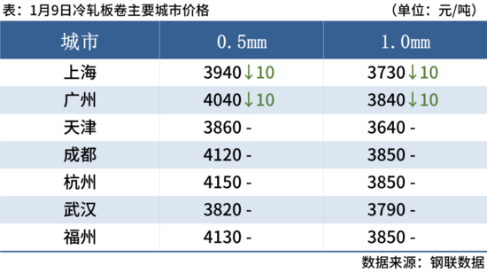 冷軋板卷1月9日,全國24個主要城市1.0mm冷卷均價3844元/噸,較上個交易日3元/噸。當前市場處于淡季,下游終端企業(yè)開工率維持低位,采購意愿普遍不強,整體成交表現(xiàn)清淡,西北地區(qū)部分大戶反饋日均成交僅在十噸左右,且多為零星小單。資源方面,市場庫存壓力仍存,部分規(guī)格資源供應相對充裕,貿(mào)易商去庫速度緩慢,預計下周冷軋板卷價格或?qū)⒗^續(xù)弱勢盤整運行