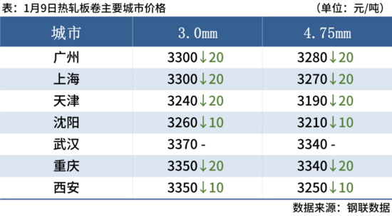 熱軋板卷1月9日,全國24個主要城市4.75mm熱軋板卷均價3306/噸,較上個交易日跌13元/噸。供應端,鋼廠產(chǎn)量增加,鋼廠庫存下降,社會庫存增加,總庫存表現(xiàn)為降庫,本周市場漲價,成交較好,但多為投機需求。價格底部支撐較強,頂部有限預計近期熱軋板卷價格或?qū)^(qū)間震蕩運行