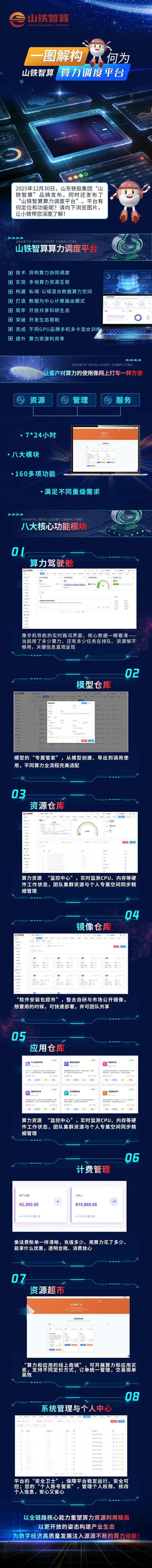 2025年12月30日,山東鐵投集團“山鐵智算”品牌發(fā)布,同時還發(fā)布了“山鐵智算算力調(diào)度平臺”。平臺有何定位和功能呢?請向下瀏覽圖片,讓小鐵帶您深度了解!