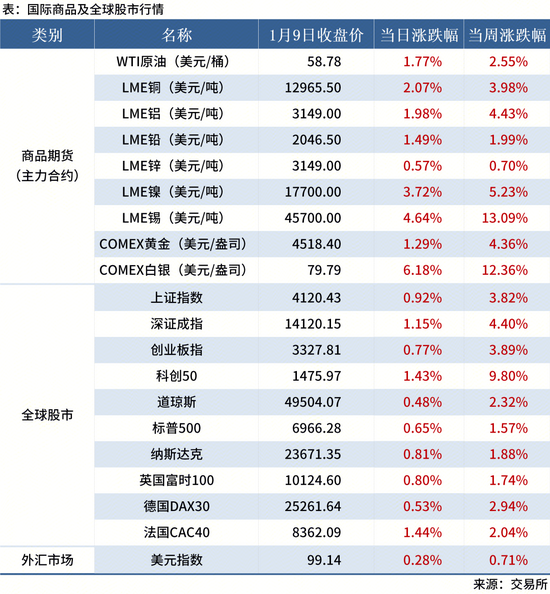 宏觀資訊:習(xí)近平同韓國總統(tǒng)李在明舉行會(huì)談;國常會(huì)指出要加強(qiáng)財(cái)政政策與金融政策配合聯(lián)動(dòng),引導(dǎo)社會(huì)資本參與促消費(fèi)、擴(kuò)投資;商務(wù)部公告加強(qiáng)兩用物項(xiàng)對(duì)日本出口管制;兩部門公告2026年4月1日起取消光伏等產(chǎn)品增值稅出口退稅;國務(wù)院印發(fā)《固體廢物綜合治理行動(dòng)計(jì)劃》,明確2030年治理目標(biāo);九部門聯(lián)合發(fā)文推動(dòng)綠色消費(fèi);歐盟碳關(guān)稅于2026年1月1日正式生效實(shí)施;2025年12月中國CPI同比上漲0.8%,回升至2023年3月份以來最高;PPI環(huán)比上漲0.2%,連續(xù)3個(gè)月上漲;美國截至2026年1月3日當(dāng)周初請(qǐng)失業(yè)金人數(shù)為?20.8萬人?,低于市場(chǎng)預(yù)期。