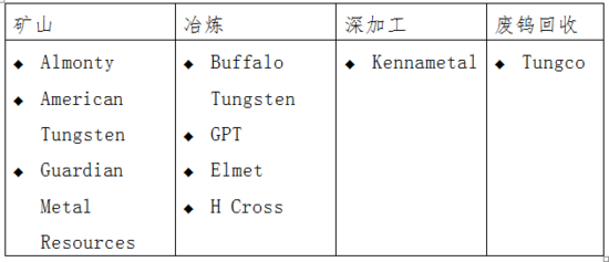 目前在美國運營的主要鎢工業(yè)企業(yè),按產業(yè)鏈環(huán)節(jié)劃分如下表。其中,阿爾蒙特(Almonty)和肯納金屬(Kennametal)分別在加拿大/澳大利亞市場(Almonty)和美國/印度市場(Kennametal)公開上市。