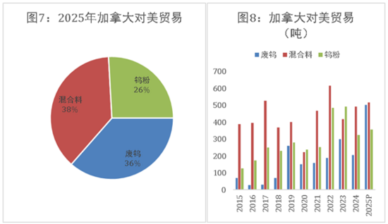 加拿大對美鎢品貿易結構整體較為穩(wěn)定,主要出口產品為廢鎢、混合料和鎢粉。2016年以前,加拿大曾是美國鎢精礦的重要供應來源,僅2015年一年就向美國出口鎢精礦987噸。2016年之后,混合料成為其對美出口的主要品類。自2018年起,加拿大對美出口的廢鎢比例持續(xù)穩(wěn)步上升,已從2017年的4%提高至當前的36%。