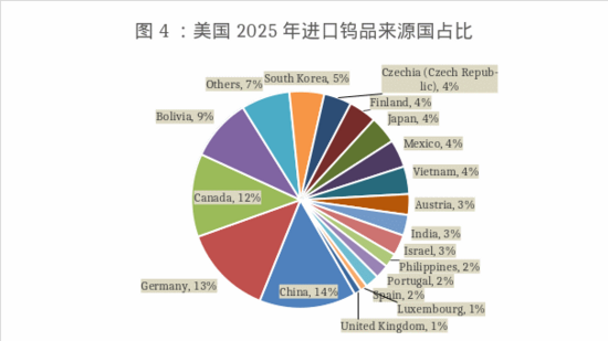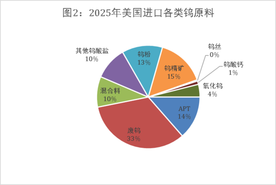 從結構看,美國從全球進口的鎢原料主要包括廢鎢、鎢精礦、APT/AMT、鎢粉、混合料及其他鎢酸鹽,另有少量氧化鎢。對比2024年與2025年數(shù)據(jù),進口占比變動最為明顯的是廢鎢與混合料:廢鎢占比同比增長4%,而混合料則同比下降7%。