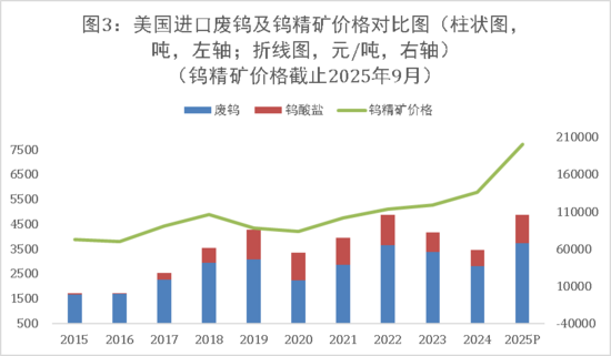 美國從全球進口的鎢原料結構呈現(xiàn)兩個顯著的“此消彼長”趨勢。其一是廢鎢與鎢精礦之間的消長:廢鎢占比從2015年的15%逐步上升至2025年的32%,而鎢精礦則從36%下降至14%。另一組變化發(fā)生在鎢酸鹽與混合料之間,其消長幅度相對平緩:同期內,鎢酸鹽從幾乎為零增至約10%,混合料則從14%降至9%左右。這一結構變化主要反映出美國鎢產業(yè)面臨的價格壓力——在鎢價持續(xù)走高的背景下,企業(yè)傾向于增加廢鎢采購以控制成本。