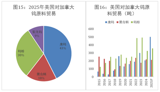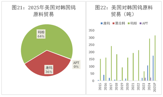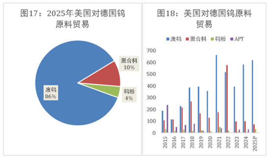 德國對美鎢原料貿易以APT和廢鎢為主,兩者合計約占其出口總量的90%。自2019年起,德國對美貿易結構出現(xiàn)轉變,從以往以APT/AMT為主導逐漸轉向以廢鎢回收為主。預計到2025年,德國有望成為美國最大的鎢原料供應國。