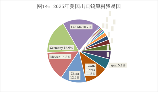 從出口目的地看,美國鎢原料主要流向加拿大、德國、墨西哥和韓國四個國家。其中,加拿大占比相對穩(wěn)定,長期維持在13%-20%;韓國則呈逐年上升態(tài)勢,份額從2015年的7%增至2025年的16%,尤其在2023至2024年間實現(xiàn)顯著躍升;墨西哥則在2017年占比沖高至44%,隨后一路下滑至19%。
