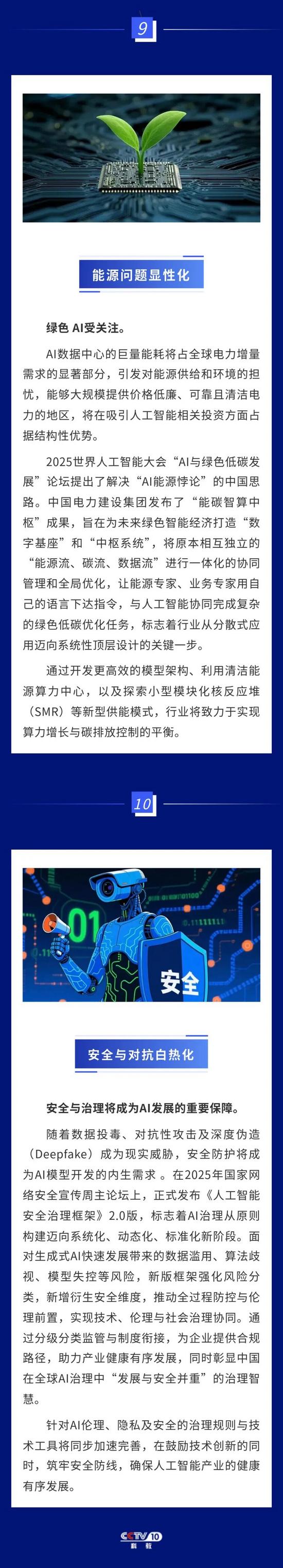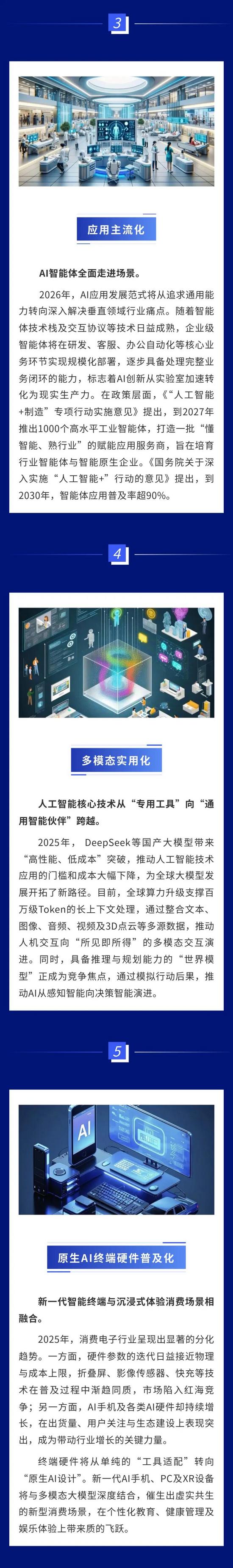近日,中央廣播電視總臺(tái)聯(lián)合工信部中國電子信息產(chǎn)業(yè)發(fā)展研究院等多家機(jī)構(gòu),發(fā)布2026年人工智能十大趨勢。趨勢涵蓋AI治理全球化、智能算力規(guī)模化、應(yīng)用主流化、多模態(tài)實(shí)用化、原生AI終端硬件普及化、AI具身智能化、專業(yè)領(lǐng)域進(jìn)一步細(xì)分和深化、前沿領(lǐng)域交叉融合化、能源問題顯性化、安全與對(duì)抗白熱化等多個(gè)維度,全面勾勒出人工智能在全球合作、技術(shù)突破、場景融合、風(fēng)險(xiǎn)防控等方面的發(fā)展藍(lán)圖。