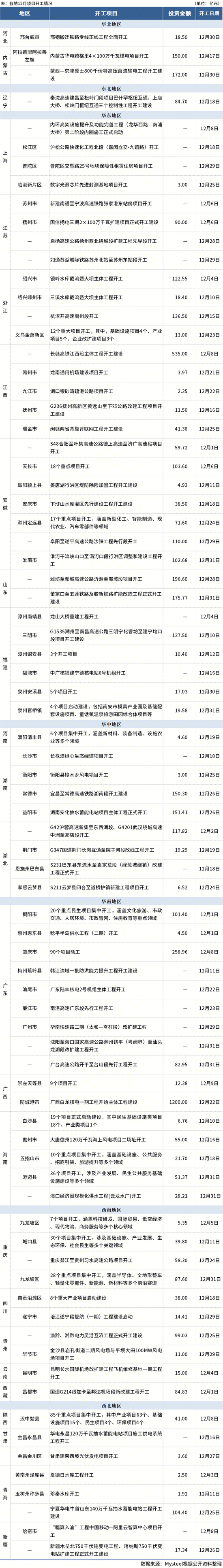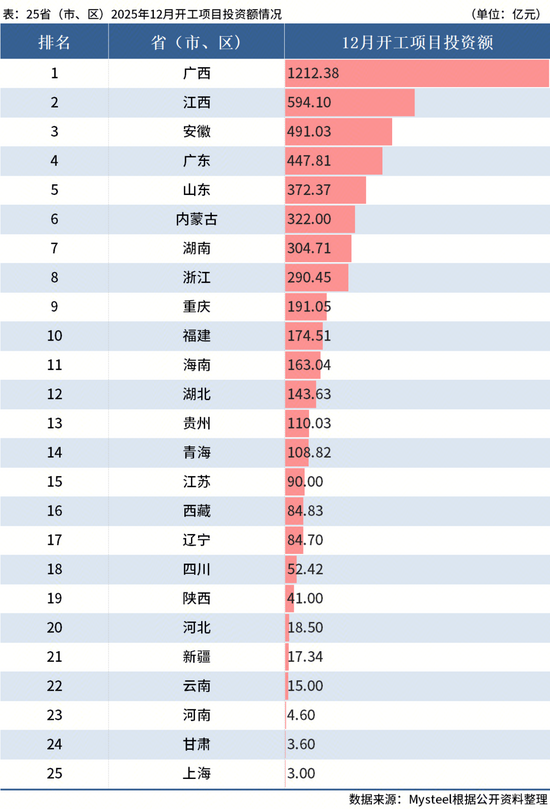 資料顯示,12月,開工投資排名前三的省份為廣西、江西、安徽,總投資分別為1212.38億元、594.10億元、491.03億元。
