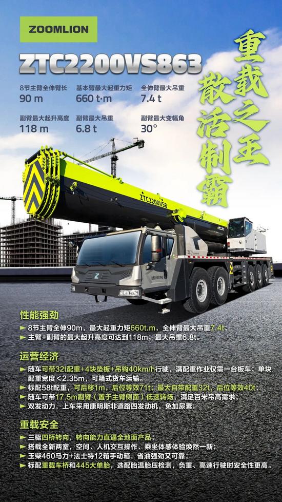 隨車可帶17.5m副臂(置于主臂側面)低速轉場,滿足百米吊高需求;