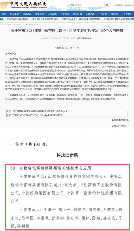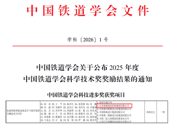 近日,2025年度中國交通運(yùn)輸協(xié)會科學(xué)技術(shù)獎和中國鐵道學(xué)會科學(xué)技術(shù)獎評選結(jié)果正式公布。山東鐵投集團(tuán)牽頭研發(fā)的“全數(shù)智化高速鐵路建造關(guān)鍵技術(shù)與應(yīng)用”項(xiàng)目榮獲中國交通運(yùn)輸協(xié)會科技進(jìn)步獎一等獎,聯(lián)合研發(fā)的“高速鐵路智能選線設(shè)計(jì)與線形保持關(guān)鍵技術(shù)及應(yīng)用”成果榮獲中國鐵道學(xué)會科技進(jìn)步獎一等獎。上述兩個獎項(xiàng)是國家科學(xué)技術(shù)獎勵工作辦公室批準(zhǔn)設(shè)立的行業(yè)權(quán)威獎項(xiàng),體現(xiàn)了相關(guān)單位在高速鐵路技術(shù)創(chuàng)新與協(xié)同攻關(guān)方面取得的顯著成績。