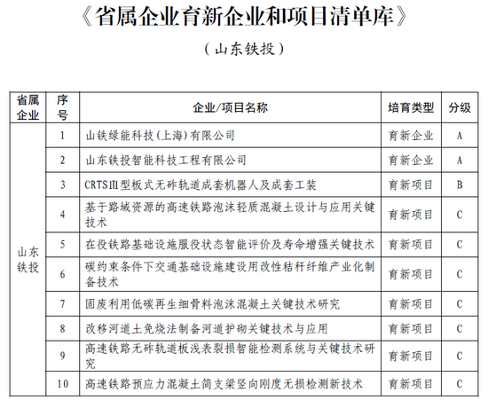 近日,山東省屬企業(yè) “育新行動” 首批入選名單正式公布,山東鐵投集團權屬智能科技工程有限公司(以下簡稱 “智科工程公司”)、山鐵綠能科技(上海)有限公司(以下簡稱 “山鐵綠能公司”)雙雙入選A類育新企業(yè), “CRTSⅢ型板式無砟軌道成套機器人及成套工裝” 項目成功入選B類育新項目,另有7個項目入選C類育新項目。
