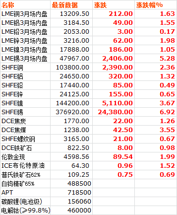12日,LME六種基本金屬價格全線上漲。三月期銅價收于13209.5美元噸,上漲1.63%。三月期鋁價收于3184.5美元噸,上漲1.55%。三月期鉛價收于2053美元噸,上漲0.17%。三月期鋅價收于3216美元噸,上漲1.98%。三月期錫價收于47967美元噸,上漲5.28%。三月期鎳價收于17888美元噸,上漲1.05%