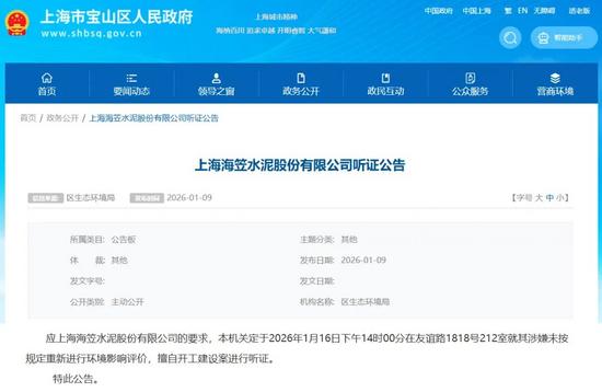 日前,上海市寶山區(qū)生態(tài)環(huán)境局發(fā)布《上海海笠水泥股份有限公司聽證公告》稱,應(yīng)上海海笠水泥股份有限公司的要求,本機(jī)關(guān)定于2026年1月16日下午14時(shí)00分在友誼路1818號(hào)212室就其涉嫌未按規(guī)定重新進(jìn)行環(huán)境影響評(píng)價(jià),擅自開工建設(shè)案進(jìn)行聽證。