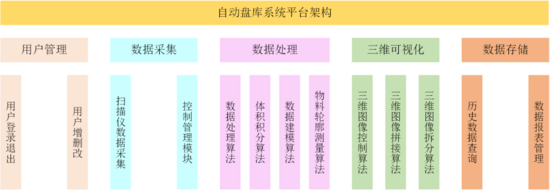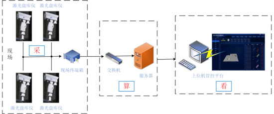 激光自動(dòng)盤(pán)庫(kù)系統(tǒng)采用模塊化設(shè)計(jì)架構(gòu),主要由數(shù)據(jù)采集模塊(采)、智能計(jì)算模塊(算)、可視化交互模塊(看)3個(gè)核心單元構(gòu)成,分別完成現(xiàn)場(chǎng)物料信息采集、服務(wù)器數(shù)據(jù)建模運(yùn)算及上位機(jī)終端可視化呈現(xiàn)功能,激光自動(dòng)盤(pán)庫(kù)系統(tǒng)總體方案設(shè)計(jì)如圖1所示。