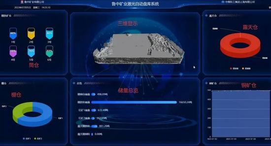 激光自動(dòng)盤(pán)庫(kù)系統(tǒng)UI顯示界面主要由三維可視化區(qū)域、儲(chǔ)量總覽區(qū)域、各類(lèi)型礦倉(cāng)存儲(chǔ)容量顯示區(qū)域3個(gè)部分構(gòu)成,激光自動(dòng)盤(pán)庫(kù)系統(tǒng)UI顯示界面如圖4所示。