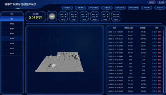 在此基礎(chǔ)上,采用經(jīng)典的Delaunay三角劃分算法,網(wǎng)格化處理獲取的煤堆點(diǎn)云數(shù)據(jù),構(gòu)建精確的三維空間幾何模型。通過(guò)對(duì)模型進(jìn)行嚴(yán)密的積分計(jì)算,得到精準(zhǔn)的煤堆體積數(shù)據(jù),平均誤差<3%,具備較好的可靠性與準(zhǔn)確性。借助高效的數(shù)據(jù)傳輸與可視化技術(shù),實(shí)時(shí)更新體積數(shù)據(jù)動(dòng)態(tài),在用戶端界面直觀顯示,方便用戶隨時(shí)查看與管理,煤量體積計(jì)算顯示界面如圖2所示。