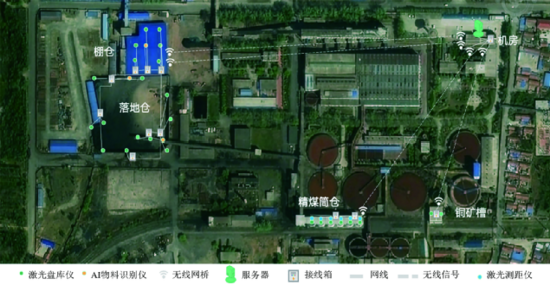 魯中礦業(yè)有限公司(簡(jiǎn)稱魯中礦)以鐵礦石采選、加工、銷(xiāo)售為主營(yíng)業(yè)務(wù),鐵礦石總儲(chǔ)量達(dá)3億t,是國(guó)有大型地下黑色冶金礦山企業(yè)。魯中礦目前擁有鐵精礦倉(cāng)6個(gè)、棚倉(cāng)1個(gè)、露天倉(cāng)1個(gè)以及銅礦倉(cāng)1個(gè),魯中礦現(xiàn)場(chǎng)安裝示意如圖6所示。為保證掃描無(wú)死角,每個(gè)筒倉(cāng)安裝激光雷達(dá)1臺(tái)、棚倉(cāng)安裝激光雷達(dá)6臺(tái)、露天倉(cāng)安裝激光雷達(dá)11臺(tái)、銅礦倉(cāng)激光雷達(dá)2臺(tái),魯中礦雷達(dá)布局示意如圖7所示,經(jīng)過(guò)1年的穩(wěn)定運(yùn)行與實(shí)際應(yīng)用驗(yàn)證,主要取得3個(gè)方面的應(yīng)用優(yōu)勢(shì)。