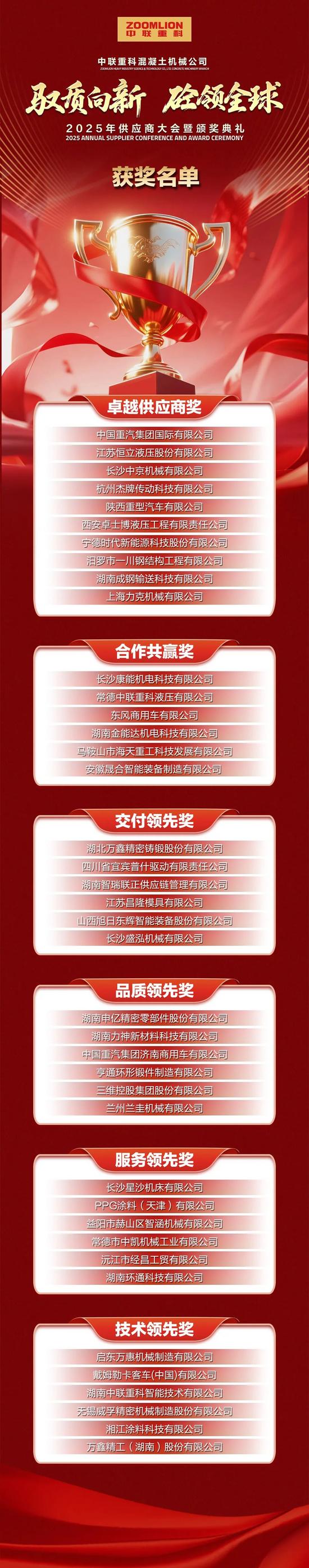 近日,中聯(lián)重科混凝土機械公司2025年供應商大會暨頒獎典禮在長沙隆重舉行,本次大會以“馭質(zhì)向新、砼領全球”為主題,匯聚來自全球各地的280家供應商合作伙伴以及內(nèi)配套單位代表,共同回顧協(xié)同成果,共話合作新篇,擘畫發(fā)展藍圖。中聯(lián)重科混凝土機械公司總經(jīng)理歐陽文志、中聯(lián)重科供應鏈管理部部長王大彥等出席會議。