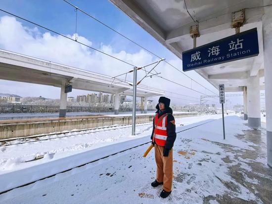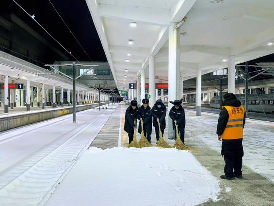 針對(duì)降雪對(duì)運(yùn)輸環(huán)節(jié)的影響,煙臺(tái)車務(wù)段第一時(shí)間啟動(dòng)應(yīng)急響應(yīng),組織人員對(duì)管內(nèi)線路道岔、站臺(tái)、進(jìn)出站通道等關(guān)鍵部位開展不間斷掃雪除冰作業(yè)。