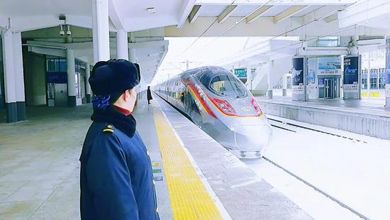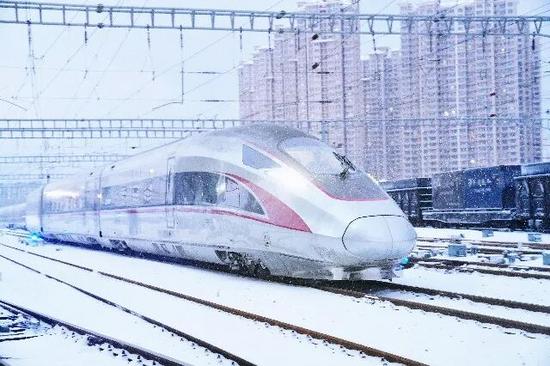 一段復(fù)興號(hào)列車沖破雪幕