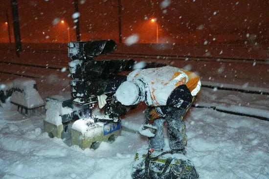 青島電務(wù)段密切跟蹤實(shí)時(shí)天氣變化,組織沿線各站作業(yè)人員利用除雪鉤、吹雪機(jī)等工具,配合融雪劑、防凍劑等物料,對(duì)降雪后易附著冰層的設(shè)備進(jìn)行全方位清掃,保障設(shè)備精準(zhǔn)穩(wěn)定運(yùn)行。