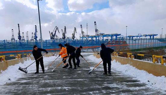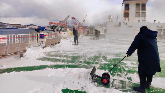 中鐵渤海鐵路輪渡對(duì)兩港站站區(qū)、旅客和車輛走行通道、火車上下船關(guān)鍵通道、道岔間隙、渡船甲板等重點(diǎn)區(qū)域開展除雪除冰作業(yè),為輪渡按時(shí)復(fù)航筑牢安全保障。
