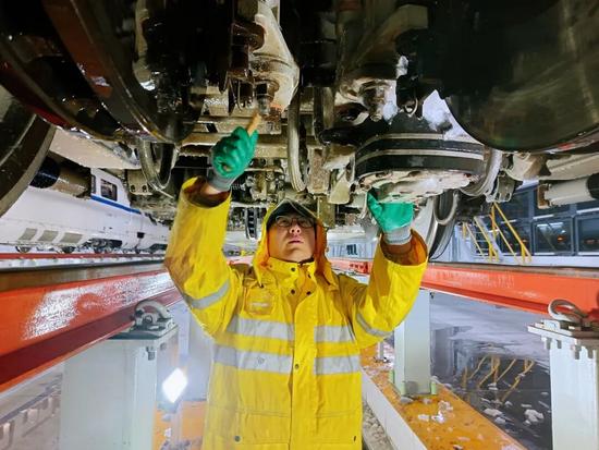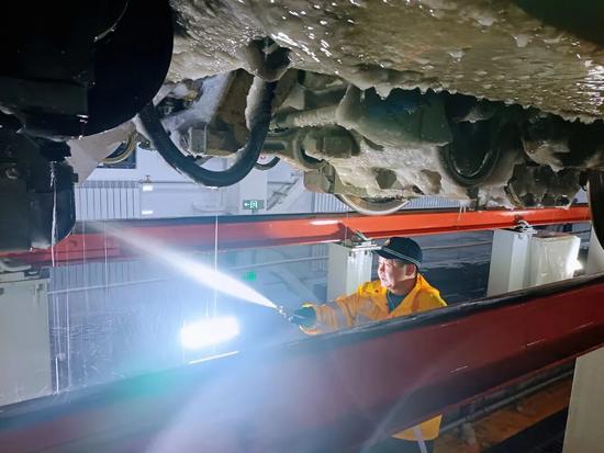 青島動(dòng)車段迅速啟動(dòng)應(yīng)急除雪預(yù)案,組織應(yīng)急除雪小組對(duì)入庫動(dòng)車組轉(zhuǎn)向架、車底等關(guān)鍵部位開展全面融冰除雪作業(yè),確保動(dòng)車組出庫質(zhì)量達(dá)標(biāo)。