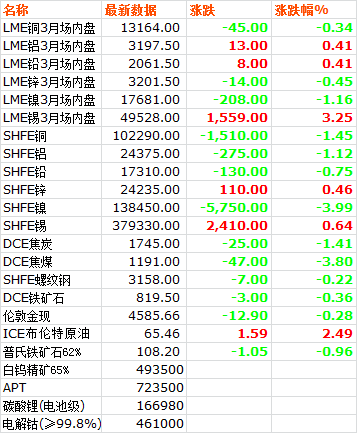 13日,LME六種基本金屬價(jià)格漲跌互現(xiàn)。三月期銅價(jià)收于13164美元噸,下跌0.34%。三月期鋁價(jià)收于3197.5美元噸,上漲0.41%。三月期鉛價(jià)收于2061.5美元噸,上漲0.41%。三月期鋅價(jià)收于3201.5美元噸,下跌0.45%。三月期錫價(jià)收于49528美元噸,上漲3.25%。三月期鎳價(jià)收于17681美元噸,下跌1.16%