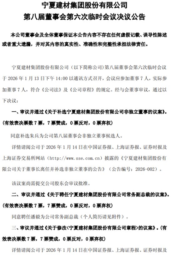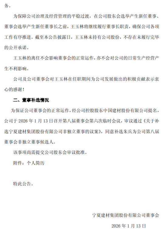 公司董事長王玉林因工作調(diào)整申請辭去公司董事、董事長及董事會戰(zhàn)略與ESG委員會主任委員、委員各項職務為保證公司董事會的正常運作,經(jīng)公司控股股東中國建材股份有限公司提名,公司于2026年1月13日召開第八屆董事會第六次臨時會議,審議通過《關于補選寧夏建材集團股份有限公司非獨立董事的議案》,同意補選朱兵為公司第八屆董事會非獨立董事候選人