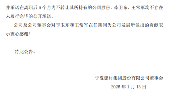 2026年1月13日,寧夏建材發(fā)布《關于公司副總裁離任的公告》《關于董事長離任并補選非獨立董事的公告》顯示,公司副總裁李衛(wèi)東王常軍因工作調(diào)整申請辭去公司副總裁職務