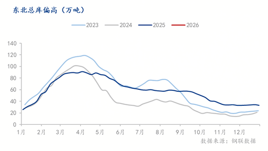 目前,10月份以來(lái),北方總庫(kù)約為2203萬(wàn)噸,同比增加18.25%,其中,東北是北方冬儲(chǔ)中氣候最極端、需求停滯最徹底的區(qū)域,特征區(qū)別于華北、西北,東北冬儲(chǔ)特征具體為:下游施工停工周期更長(zhǎng)、被動(dòng)冬儲(chǔ)為主,貿(mào)易商冬儲(chǔ)更多是響應(yīng)鋼廠政策,保量協(xié)議、資源外流特征顯著、倉(cāng)儲(chǔ)與物流成本高等。今年?yáng)|北庫(kù)存在北方地區(qū)累庫(kù)最為明顯,東北總庫(kù)存約551萬(wàn)噸,同比增加113%。主要東北降雪氣候來(lái)臨,2026年1月東北建筑鋼材南發(fā)總量在鋼廠控產(chǎn)減產(chǎn)的基礎(chǔ)上有所減少,南發(fā)壓力相對(duì)上月減輕。但是螺紋1月計(jì)劃產(chǎn)量年同比降幅超過(guò)30%,也是歷年來(lái)的新低,東北整體螺紋需求較差。