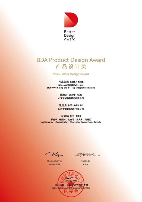 新年伊始,喜訊傳來!近日,山河智能創(chuàng)新產(chǎn)品——SWZG1000攪拌植樁一體機,在由中央廣播電視總臺、廣東省人民政府、廣州市人民政府、深圳市人民政府共同指導的“越來越好”國際設(shè)計大賽(BDA)中,榮獲“產(chǎn)品設(shè)計獎”,這是繼該產(chǎn)品在技術(shù)創(chuàng)新與市場應(yīng)用領(lǐng)域?qū)耀@認可后,在工業(yè)設(shè)計方面獲得的權(quán)威認證。