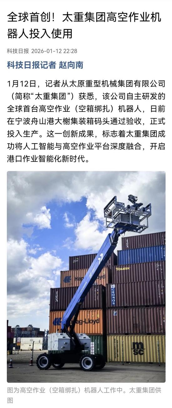 1月12日,科技日?qǐng)?bào)以《全球首創(chuàng)!太重集團(tuán)高空作業(yè)機(jī)器人投入使用》為題,對(duì)太重集團(tuán)這一創(chuàng)新成果進(jìn)行深度報(bào)道。這款全球首臺(tái)高空作業(yè)(空箱綁扎)機(jī)器人的投用,標(biāo)志著太重成功將人工智能與重型裝備深度融合,實(shí)現(xiàn)了在復(fù)雜高危場(chǎng)景下“機(jī)器換人”的關(guān)鍵突破,大幅提升了作業(yè)安全性與工作效率,引領(lǐng)港口高空作業(yè)進(jìn)入智能化時(shí)代。這既是太重創(chuàng)新驅(qū)動(dòng)、發(fā)展新質(zhì)生產(chǎn)力的生動(dòng)實(shí)踐,也為行業(yè)智能化轉(zhuǎn)型提供了“太重方案”,彰顯了公司在高端裝備領(lǐng)域持續(xù)創(chuàng)新、推動(dòng)制造業(yè)高質(zhì)量發(fā)展的使命擔(dān)當(dāng)