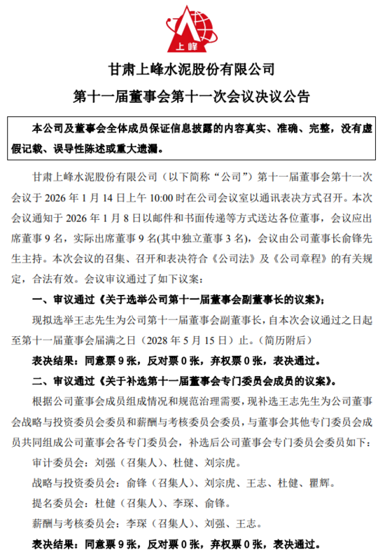 日前,上峰水泥發(fā)布《第十一屆董事會第十一次會議決議公告》顯示,公司第十一屆董事會第十一次會議審議通過選舉王志先生為公司第十一屆董事會副董事長,自本次會議通過之日起至第十一屆董事會屆滿之日(2028 年 5 月 15 日)止。