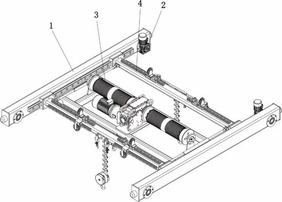 專利摘要顯示,發(fā)明是一種多吊點起升機構,涉及起重機技術領域,包括小車架、驅動輪、起升裝置和十字調節(jié)機構。驅動輪安裝于小車架兩側,使小車沿軌道行走;起升裝置設四個可同步升降的吊鉤,確保重物受力均勻且姿態(tài)穩(wěn)定,適用于大型或高價值物品的吊裝。十字調節(jié)機構能調整前、后及左、右吊鉤間的間距與高低位置,適應不同負載需求。起升裝置包含驅動裝置、雙聯卷筒、改向輪組和鋼絲繩,形成穩(wěn)定的四點吊裝結構,增強了系統(tǒng)冗余度與抗擺動能力。十字調節(jié)機構通過縱向滑軌、連接梁等組件實現靈活的空間位姿調整,無需更換吊具或重新綁扎。本發(fā)明顯著提高了作業(yè)效率、操作便捷性和安全性。
